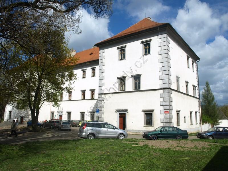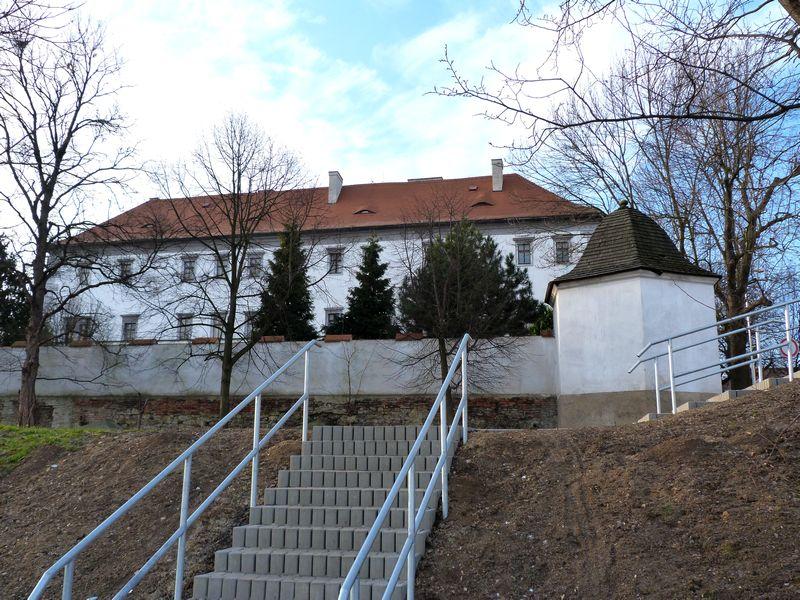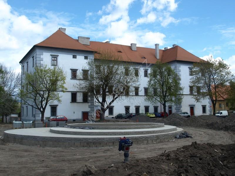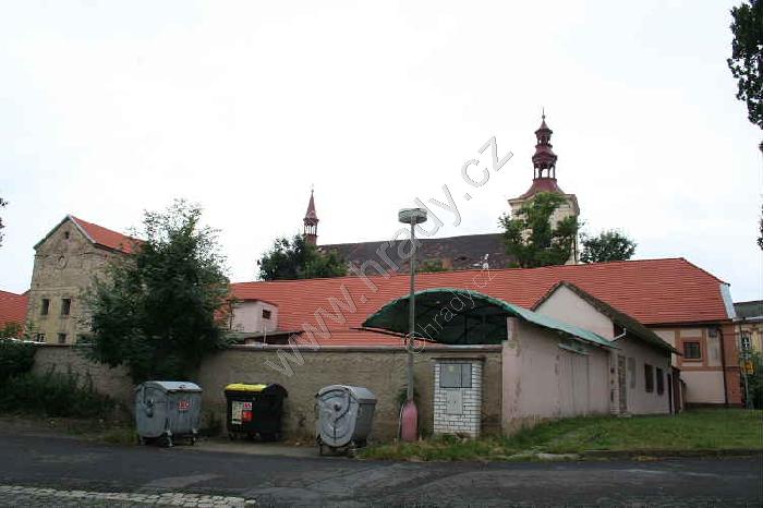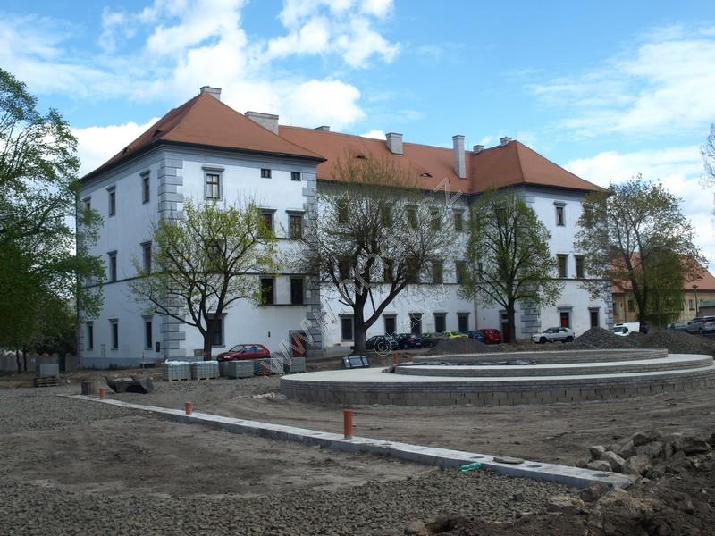 Pohled přes zbylou část zámeckého hospodářského dvora ke kostelu