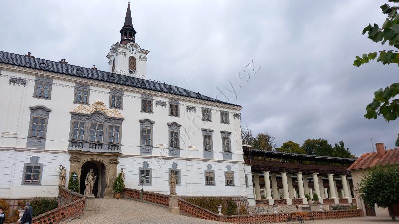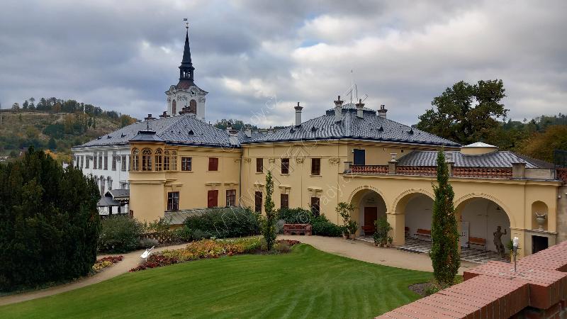 vlevo západní křídlo zámku, v pozadí střecha "Důchodu"
