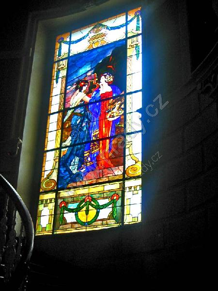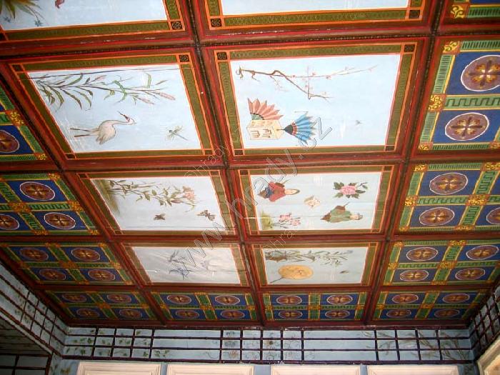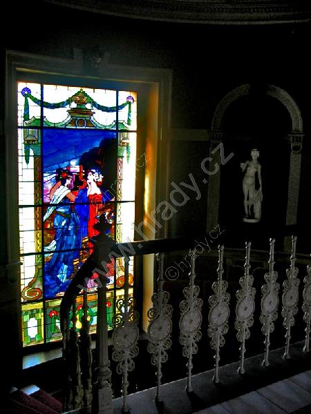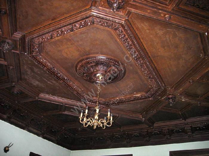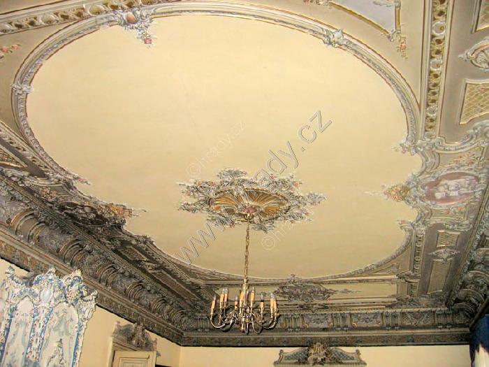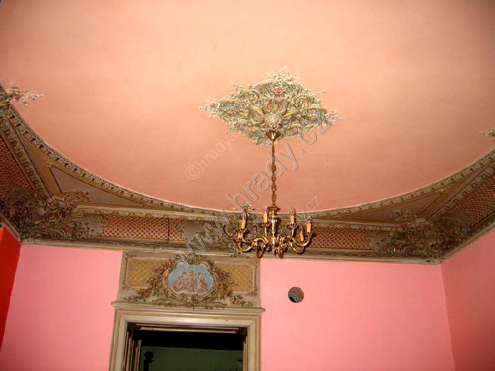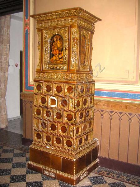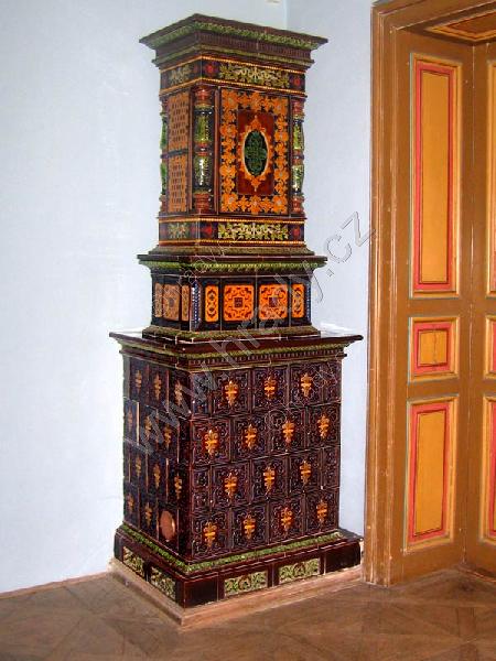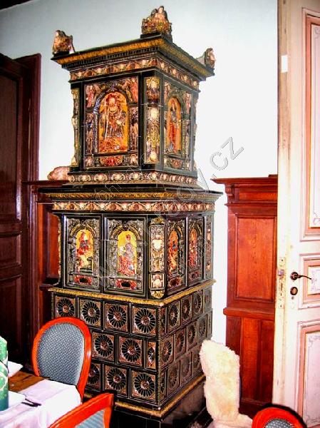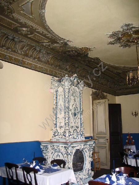 Kachlová kamna v zámeckém pokoji, nyní v restauraci.