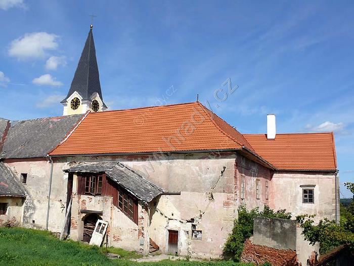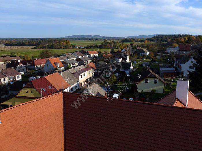 Pohled z kostelní věže přes střechy zámku na Novohradské hory