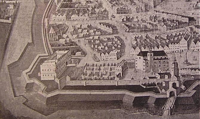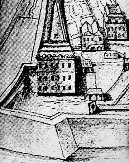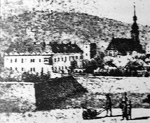 zámek a přilehlý johanitský kostel na kresbě F. Biely z r. 1813
