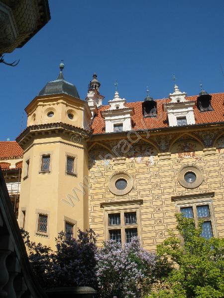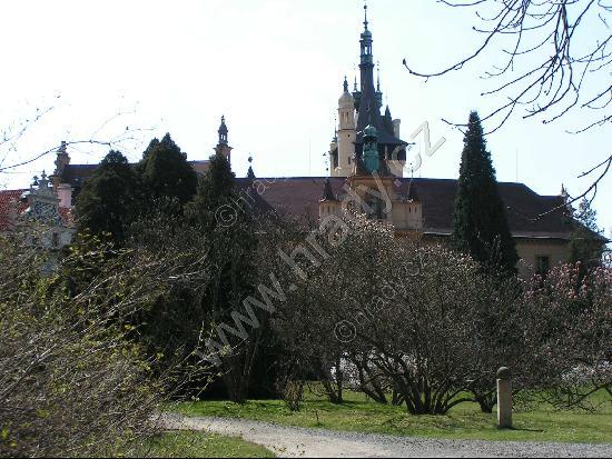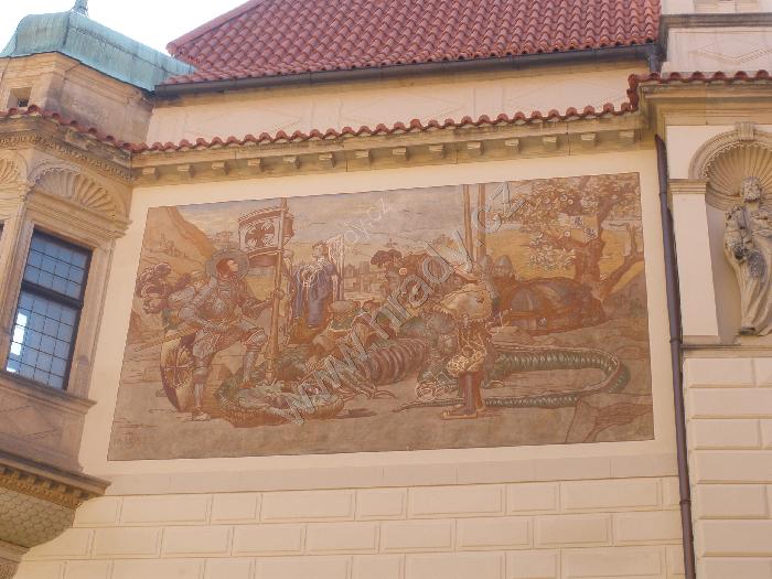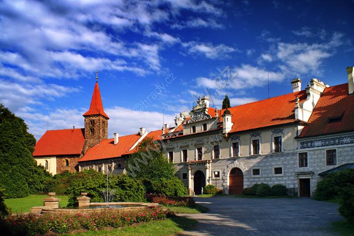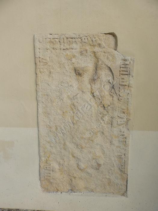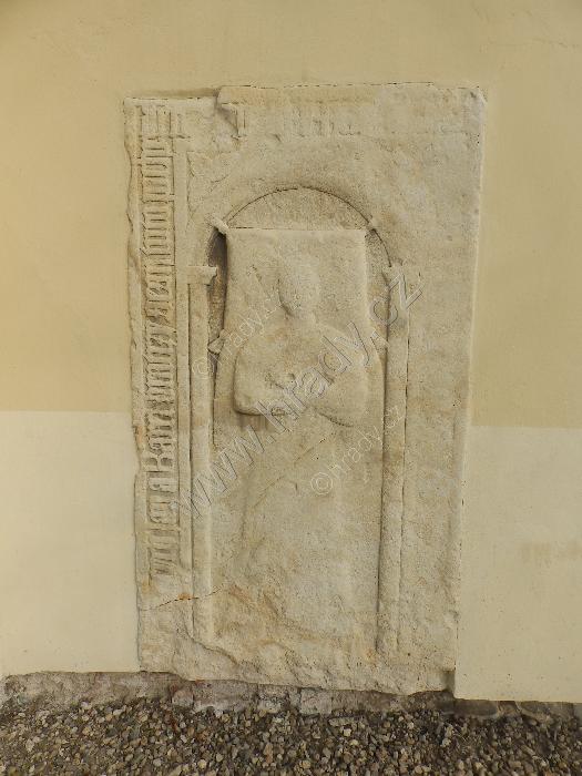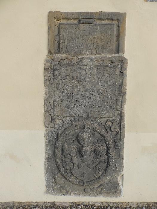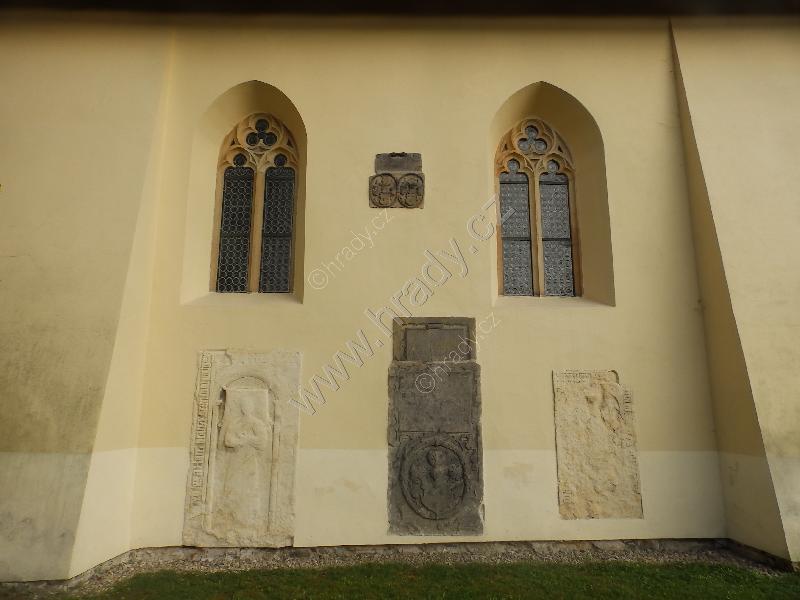 Severní stěna kostela Narození Panny Marie se zazděnými náhrobníky Zapských ze Zap