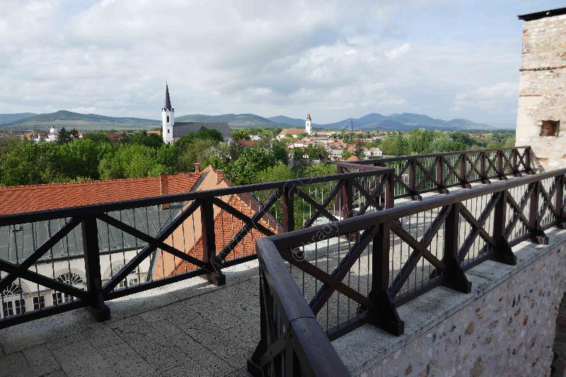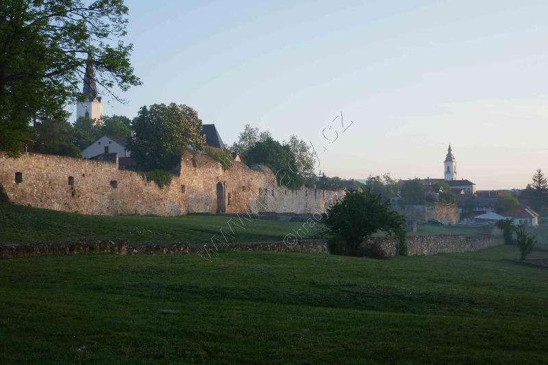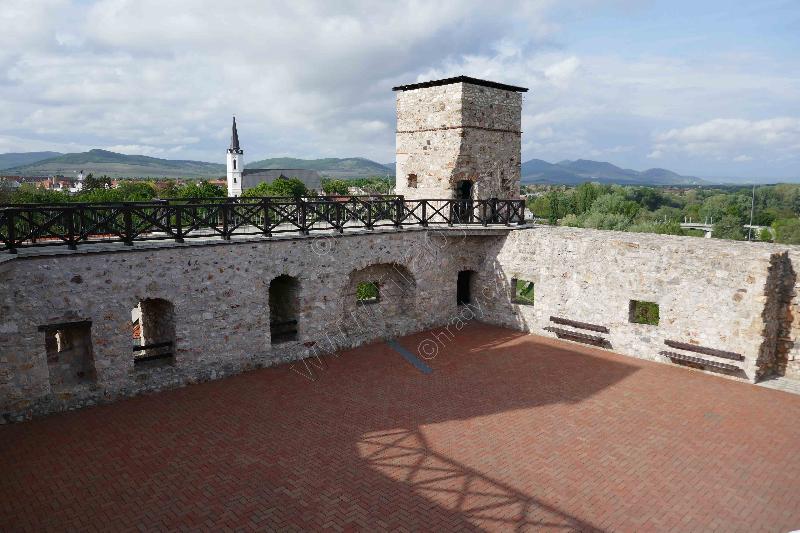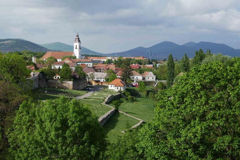 Východní opevnění předhradí na straně nad Bodrogem. Na pozadí je město se Zemplínskými vrchy.