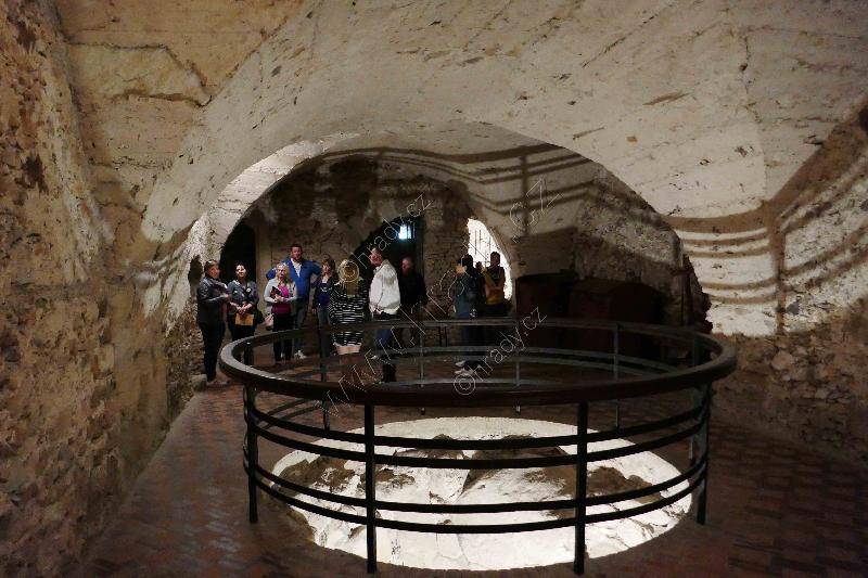 Přízemí Červené věže se skladovacími kopkami ve skále.