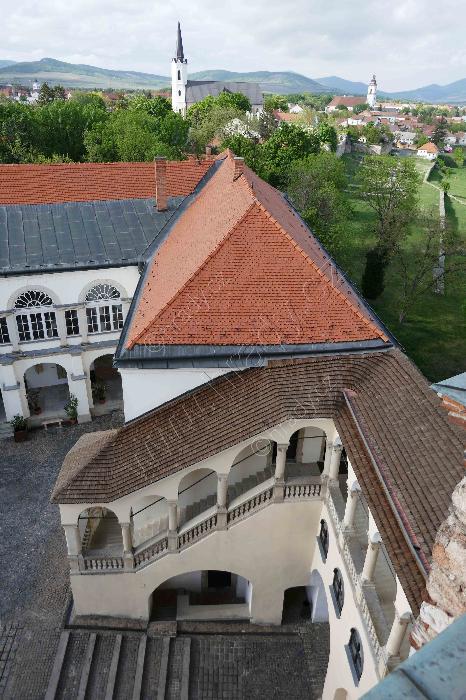 Pohled z Červené věže na východní křídlo zámku s arkádovým schodištěm.