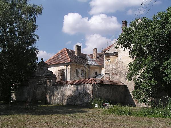 Celkový pohled na zámek s renesanční ohradní zdí a barokní branou v popředí