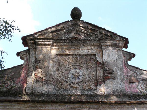 Volutový štít se šternberským erbem na barokní bráně v ohradní zdi