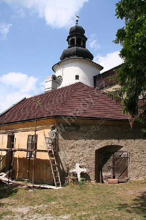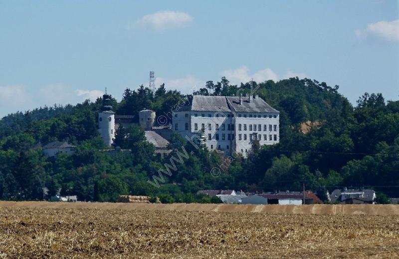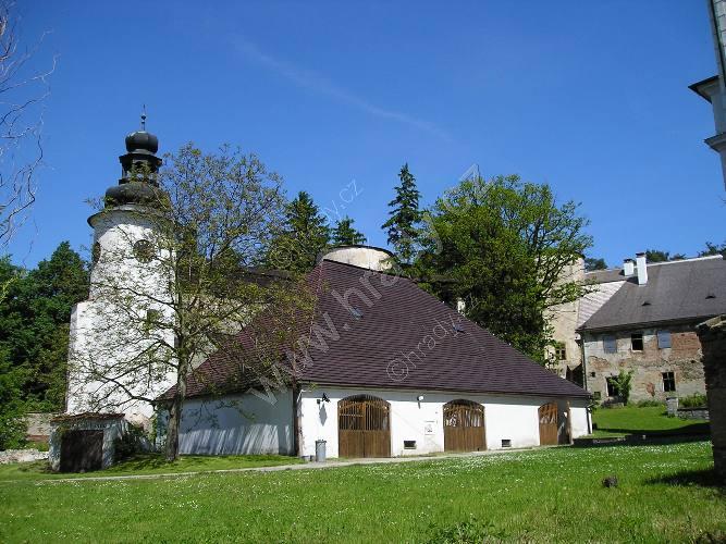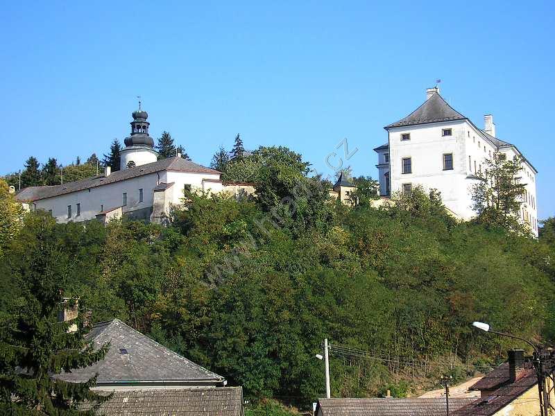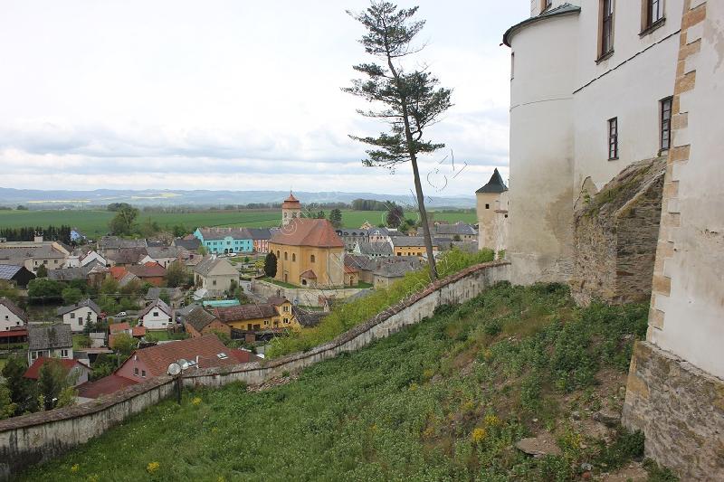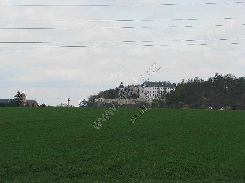 pohled na kostel v obci Úsov od přístupové cesty k zámku