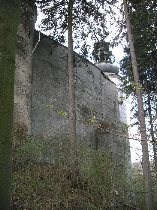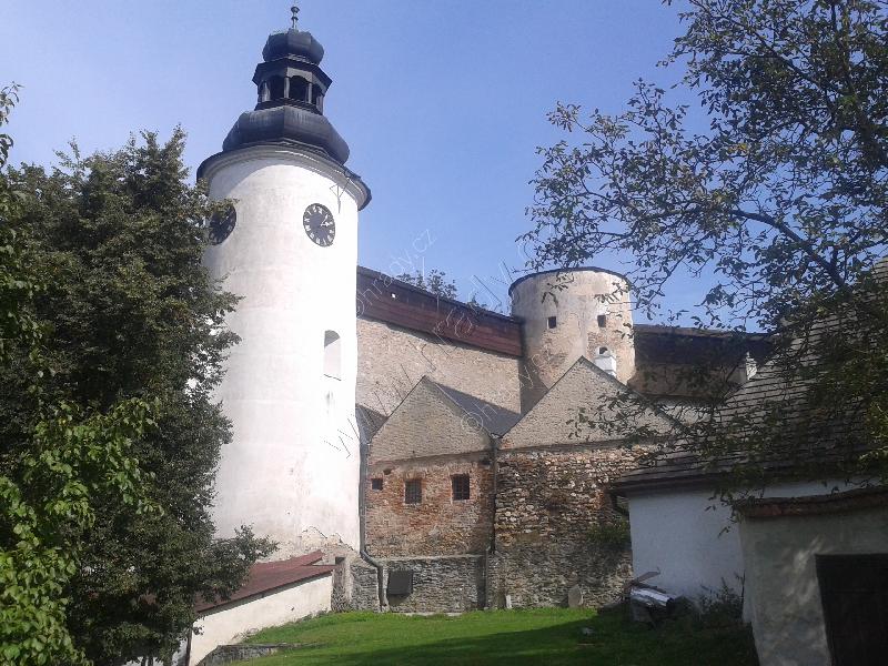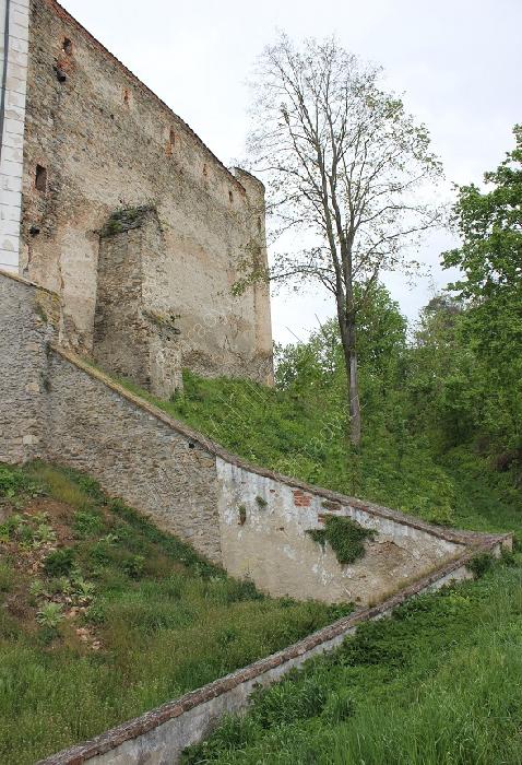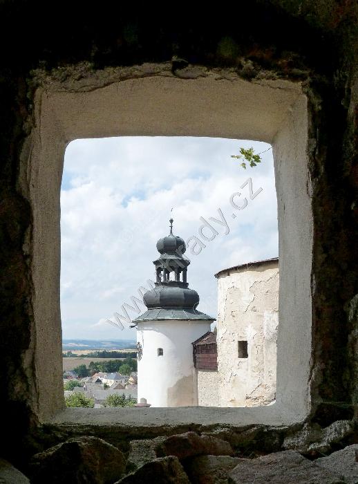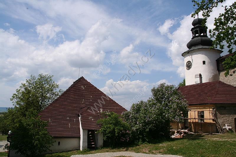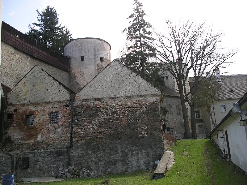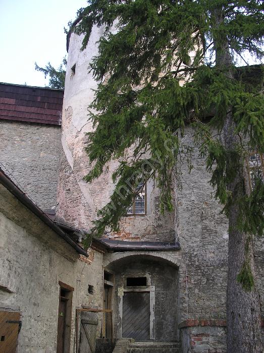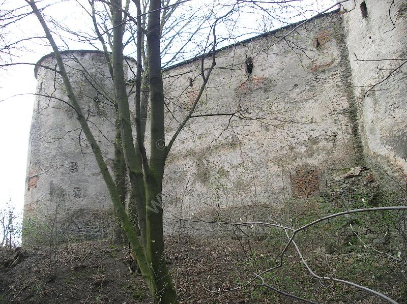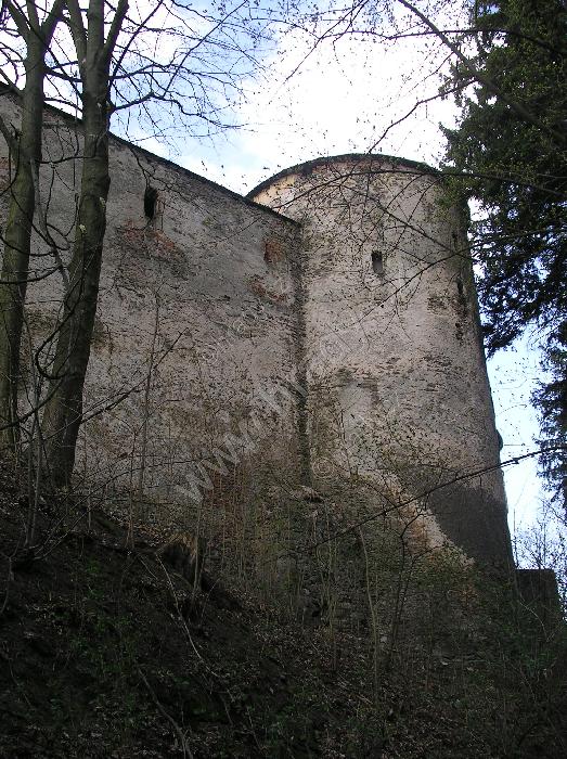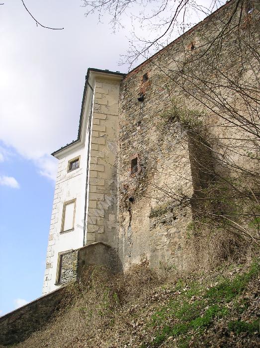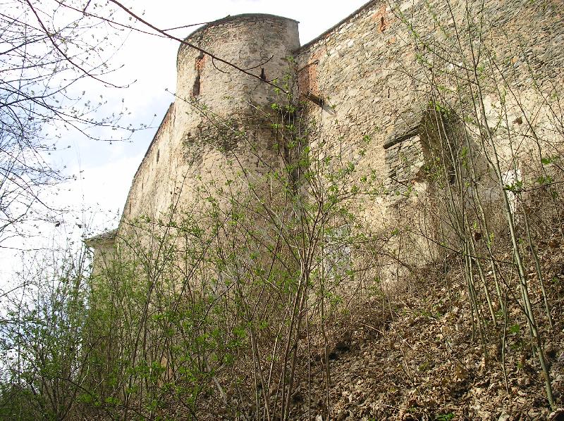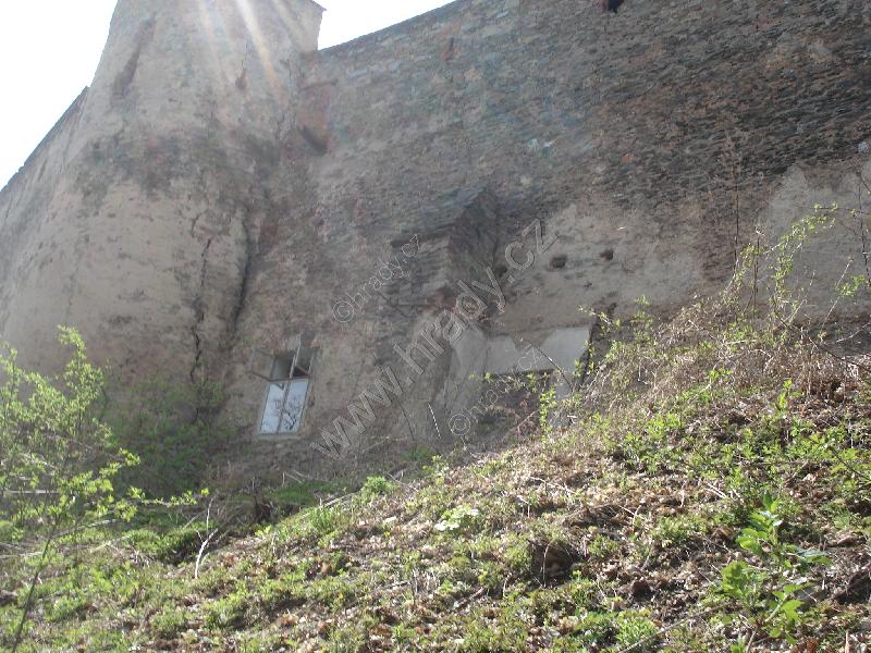 bližší pohled na původní obrannou partii hradu a na nejzachovalejší z několika obranných věžic (tzv. Hladomornu)