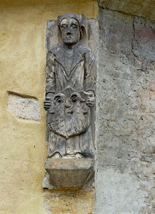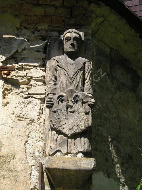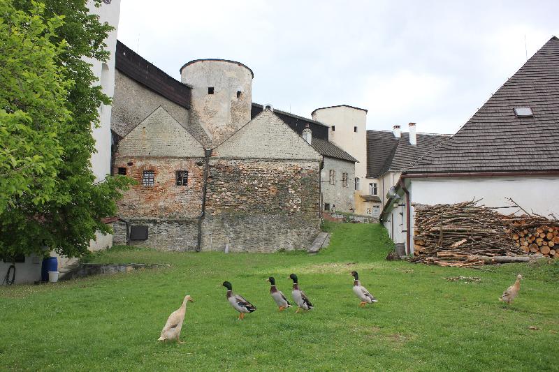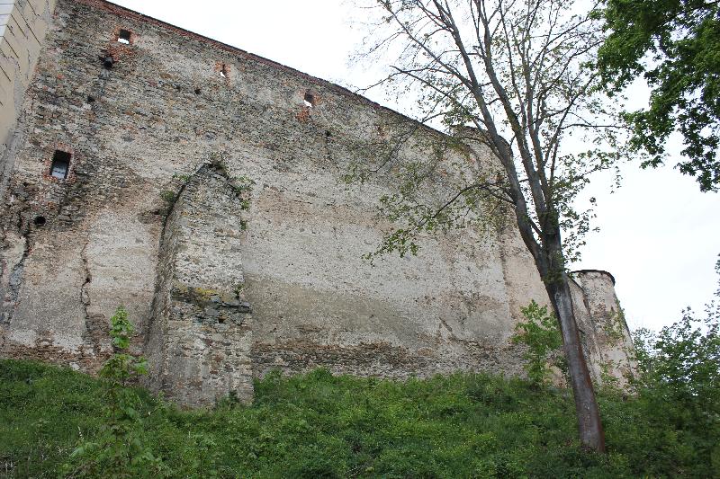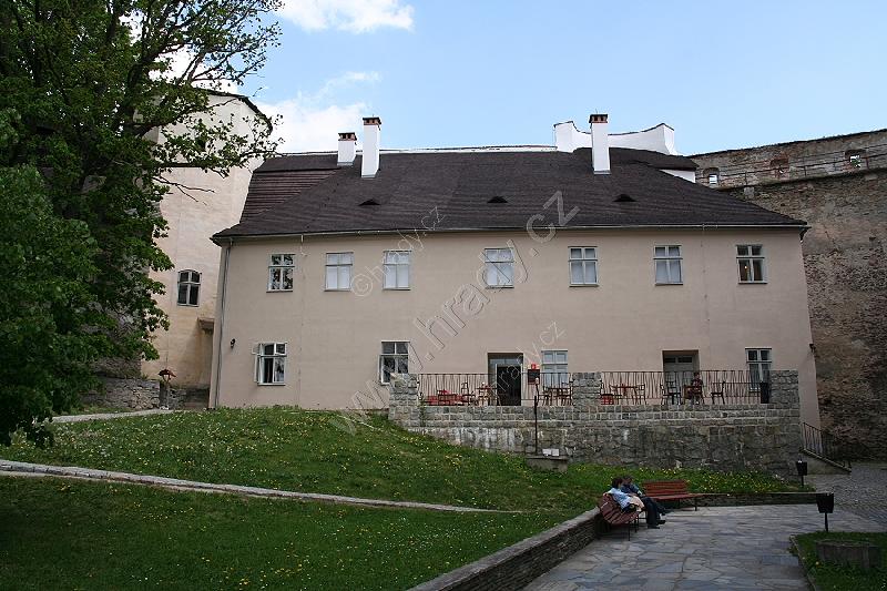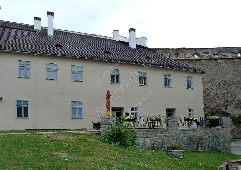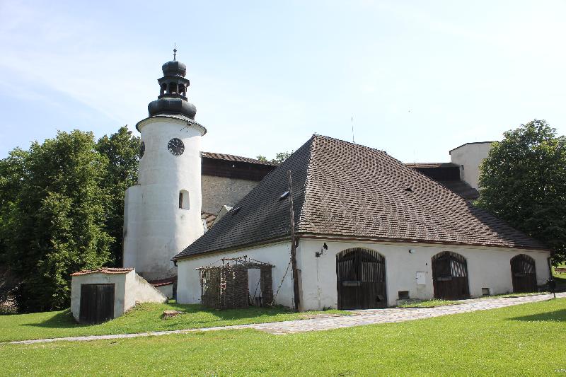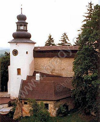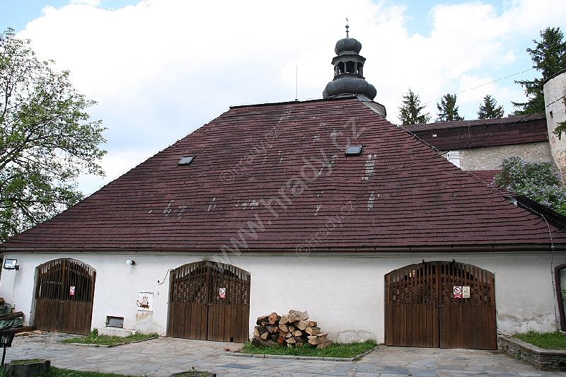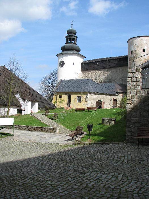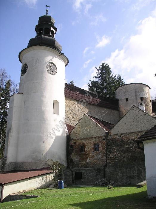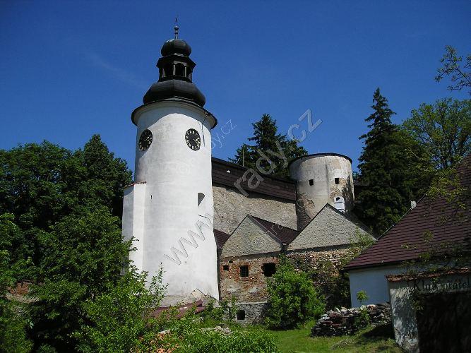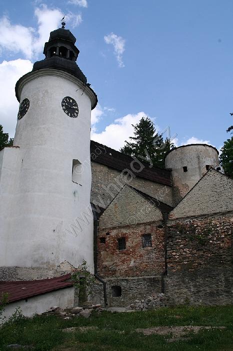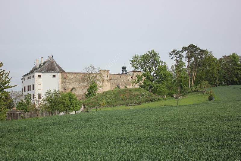 bližší pohled na původní obrannou partii hradu a na nejzachovalejší z několika obranných věžic (tzv. Hladomornu)