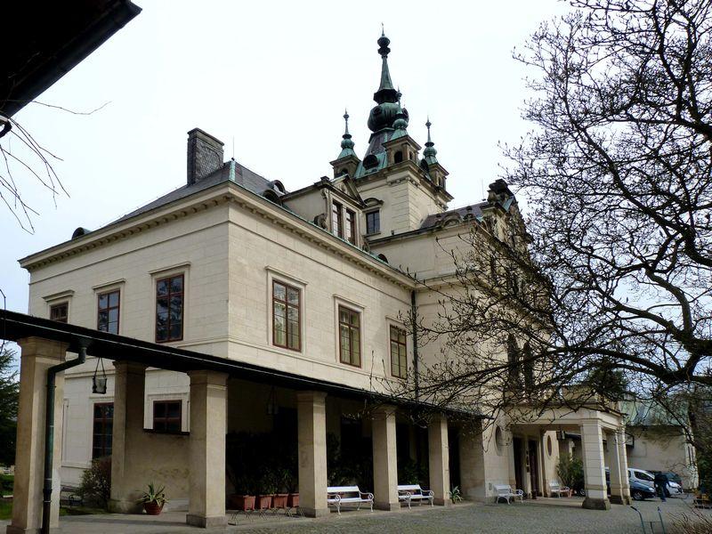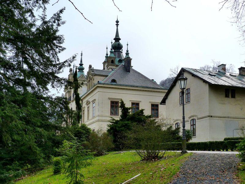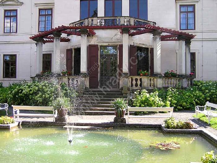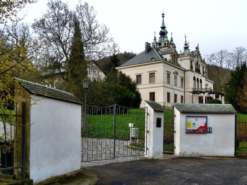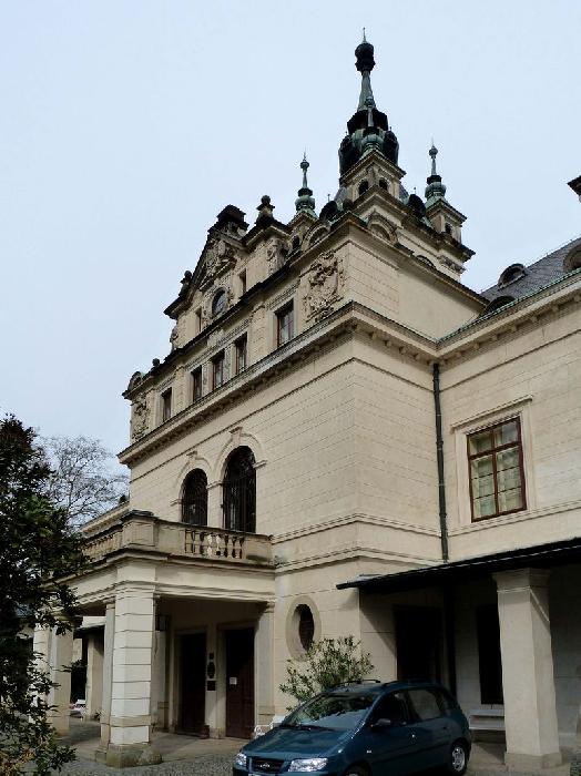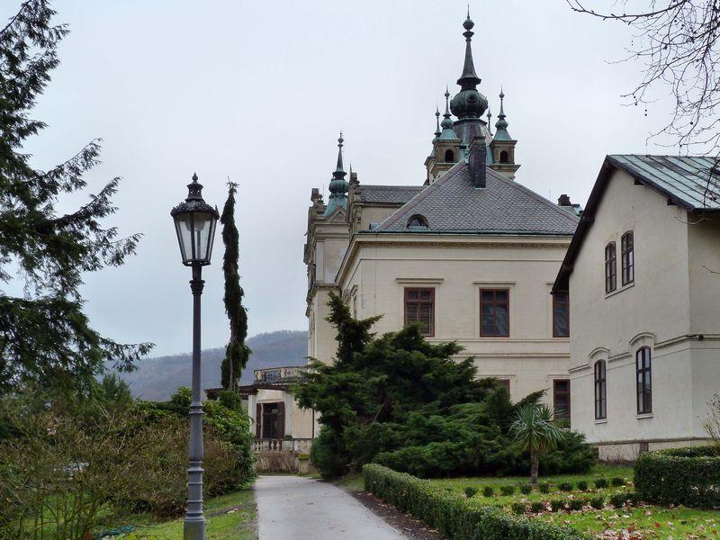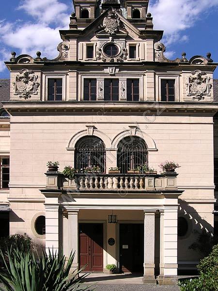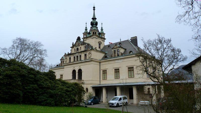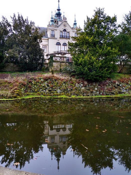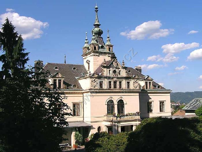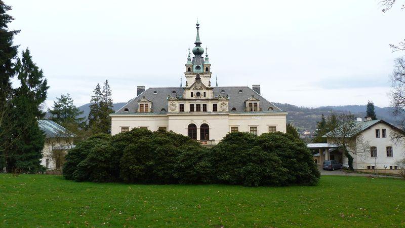 Velké Březno, plán přízemí zámku. Dvojitými šrafami značeno zdivo z doby výstavby budovy ve čtyřicátých letech 19. století, mladší zdivo neznačeno. Kresba autor.