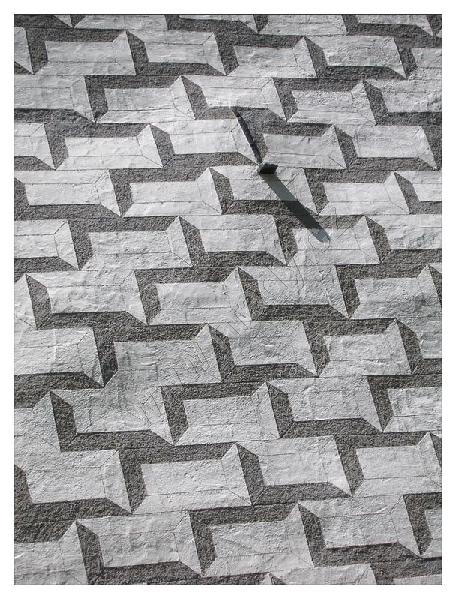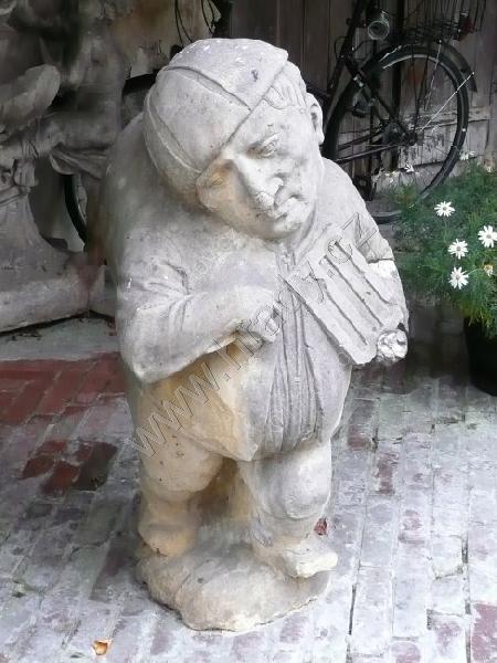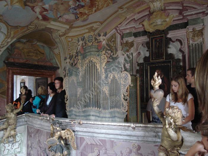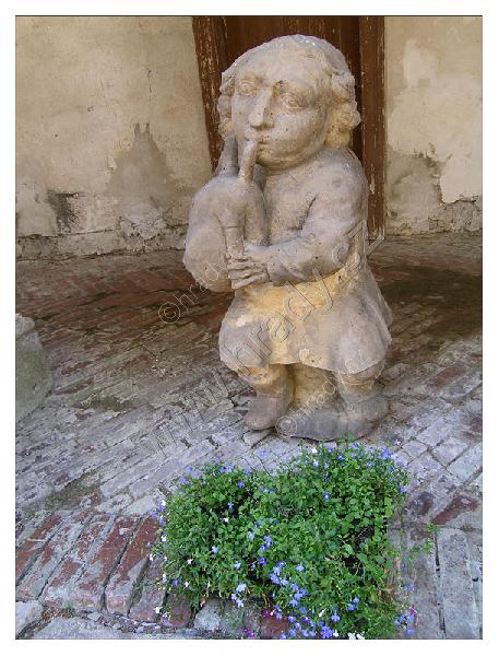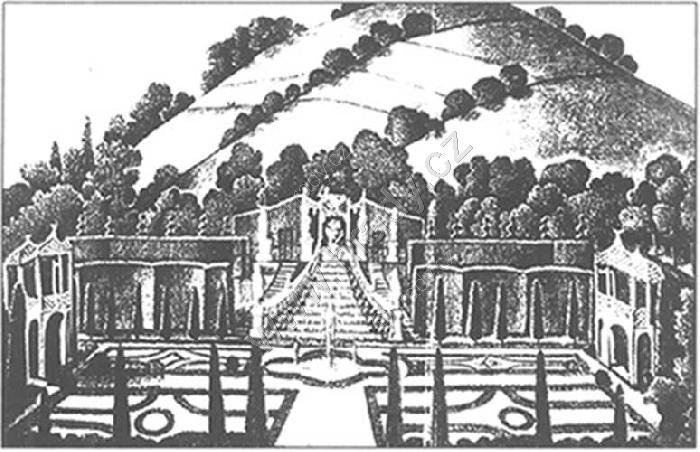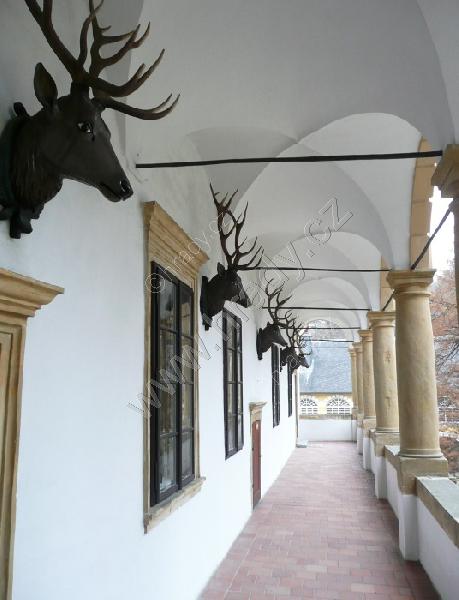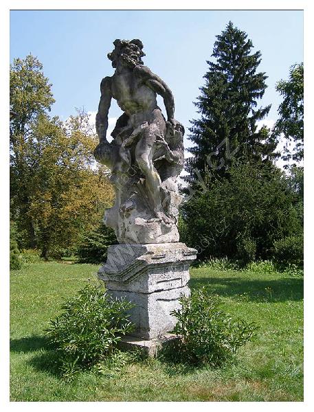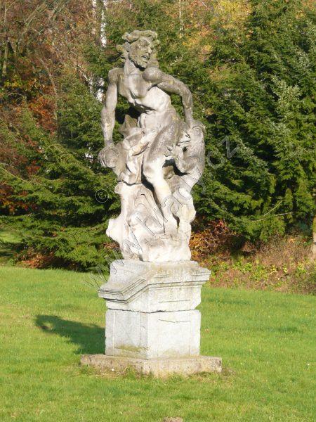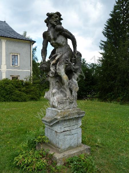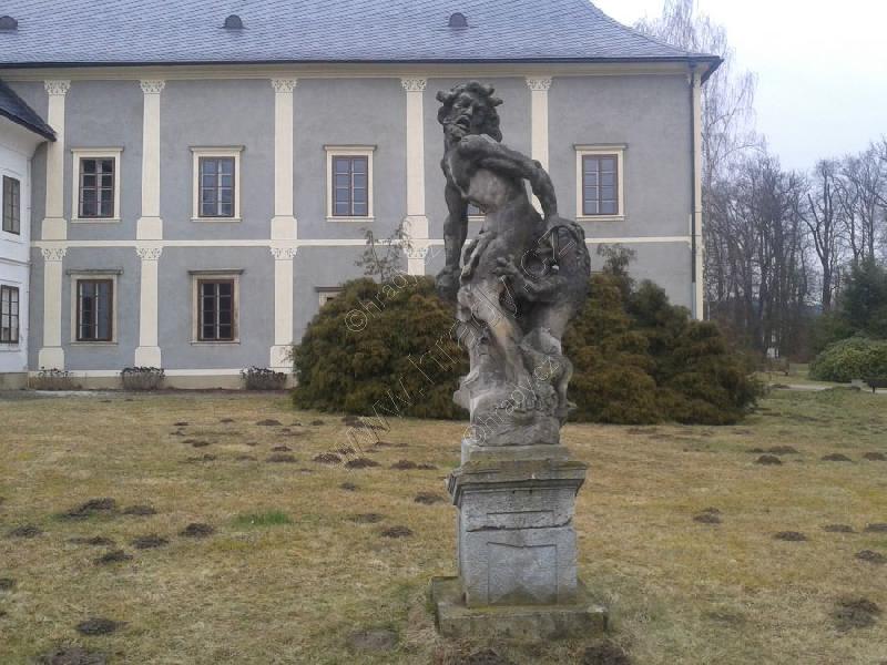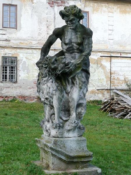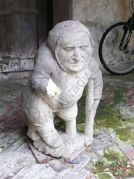 sochy bizardních postaviček stojí pod loubím barokního zámku