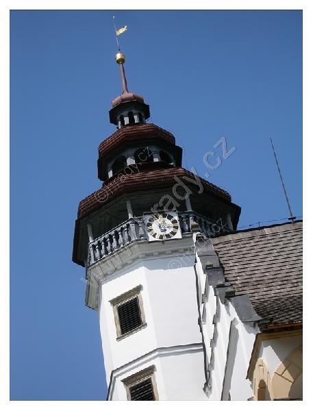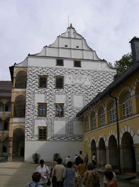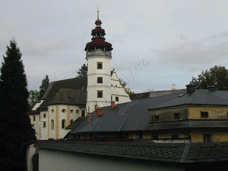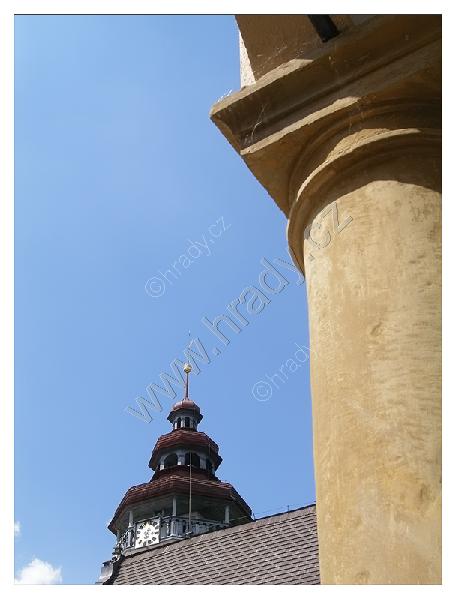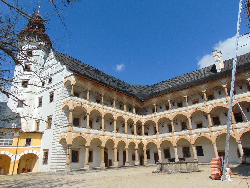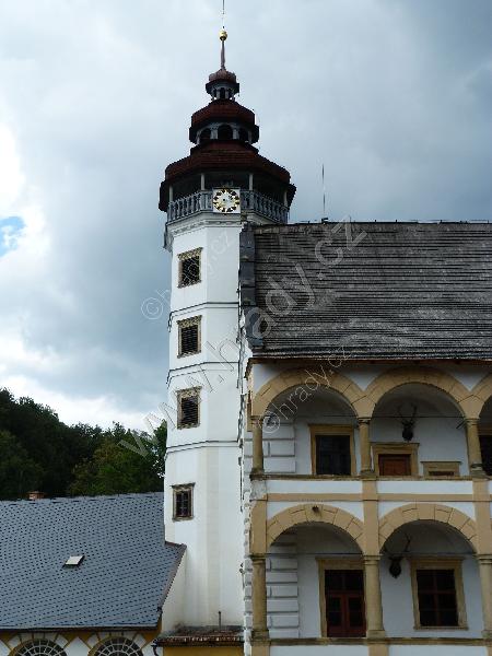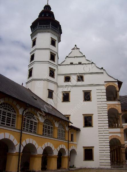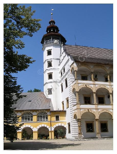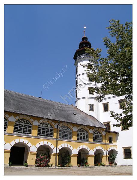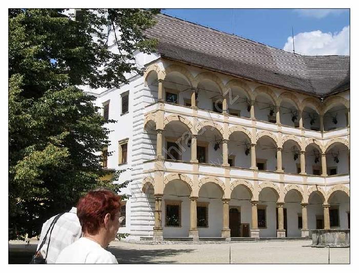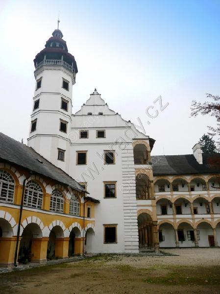 část severního a zapadní křídlo renesančního zámku s arkádami a věží