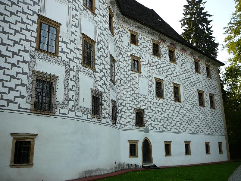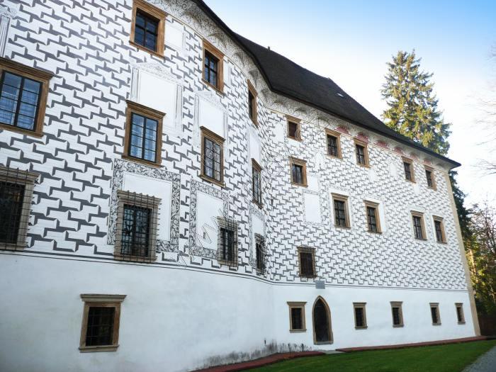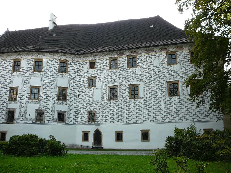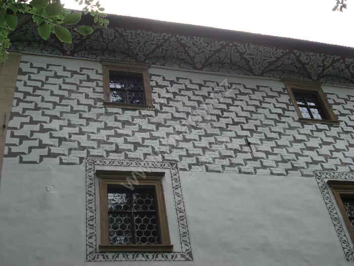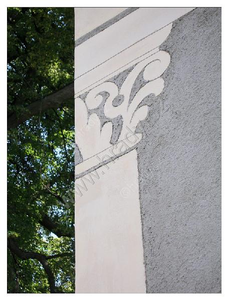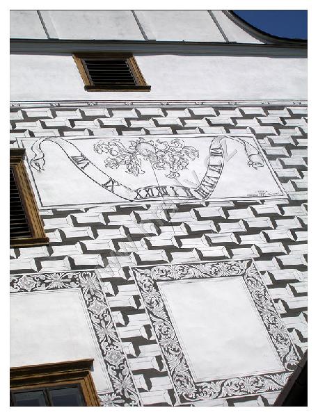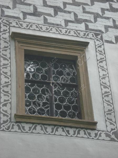 Okno s renesančním ostěním a sgrafitem na bočním křídle