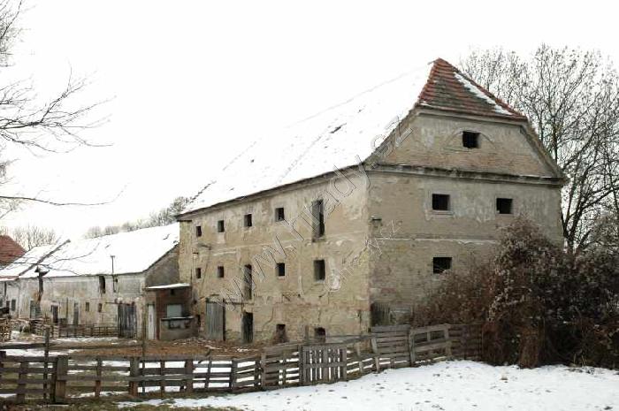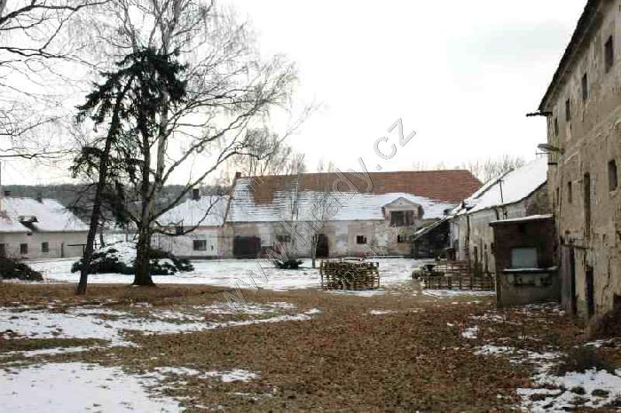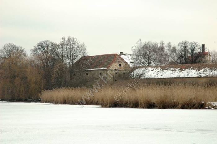 Pohled na hospodářské budovy od zamrzlého rybníka