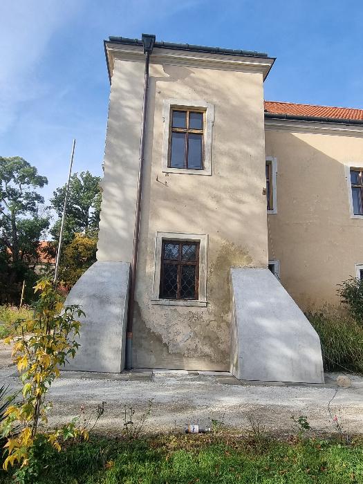 Zrekonstruované vstupní průčelí již bez přístavby v levé části