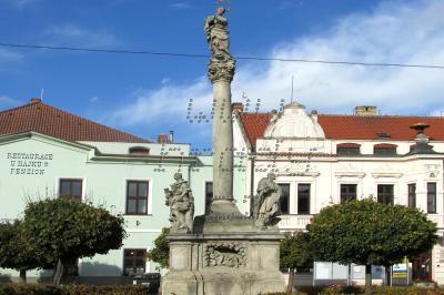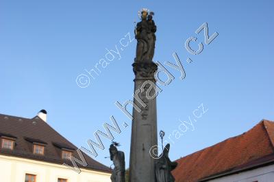 Mariánský sloup z roku 1781 od L. Huebera z Českých Budějovic v těžišti Masarykova náměstí. Na podstavci sochy sv. Alžběty, Josefa a Vojtěcha, reliéfy sv. Floriána a Jana Nepomuckého. Na vrcholu trojbokého obelisku socha Immaculaty.
