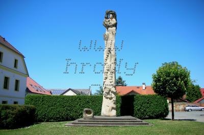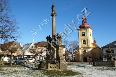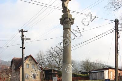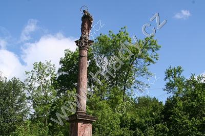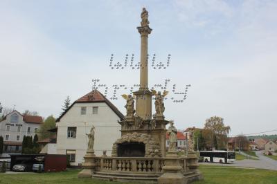 Morový sloup z roku 1720. Na vrcholu socha Panny Marie a u země obklopen sochami svatých Josefa, Barbory, Jana Nepomuckého, Šebestiána, Víta, Kateřiny, Václava a Floriána.