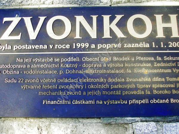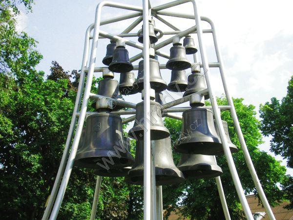 detail zvonů a jejich upevnění na konstrukci zvonkohry, každý zvon nese znak obce Brodek u Přerova